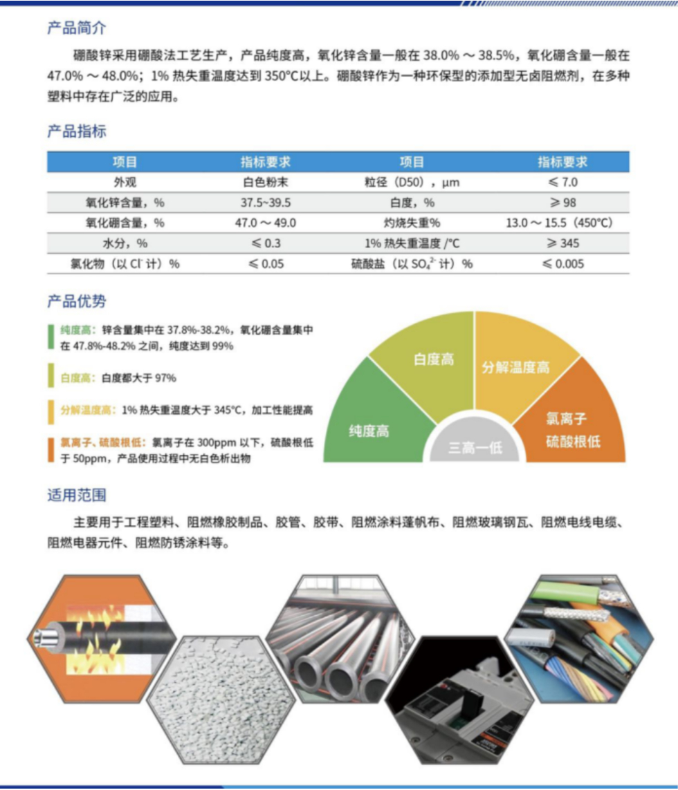 簡述: 硼酸鋅采用硼酸法工藝上產,產品純度高,氧化鋅含量一般在38%-38.5%,氧化硼含量一般在47¥-48%;1%熱失重溫度達到350℃以上。硼酸鋅作為一種環保型的添加型無鹵阻燃劑,在很多塑料中存在廣泛的應用